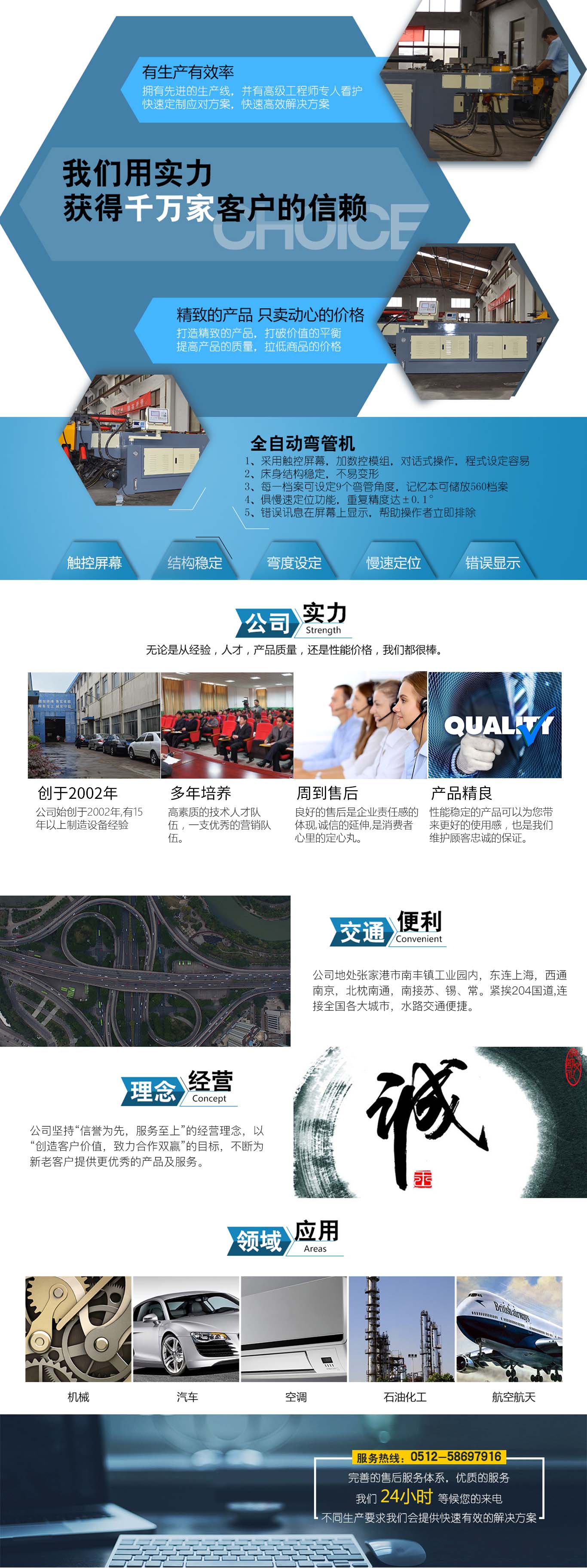 張家港市雙和機械制造有限公司始建于2001年,占地面積12000平方米,南鄰蘇州、無錫、上海,東鄰常州、南京,交通便利,位長三角中間地段,風(fēng)景優(yōu)美的張家港。 雙和公司至創(chuàng)立開始,引進(jìn)了國外的設(shè)計制造理念,組建了企業(yè)生產(chǎn)管理優(yōu)秀團隊,致力于管材加工機械研發(fā)、設(shè)計、制造。創(chuàng)新的設(shè)計理念,嚴(yán)格的質(zhì)量把關(guān),專業(yè)的售后服務(wù),不斷提升了我在整個行業(yè)的影響力。 雙和公司生產(chǎn)的系列產(chǎn)品分為彎管機、切管機、縮管機、磨齒機、伺服彎管機、數(shù)控彎管機、液壓彎管機、自動切管機、管端成型機、倒角機、大弧滾圓機、鋁切機、壓彎機等管材加工機械,廣泛用于航天業(yè)、造船業(yè)、汽車制造、鍋爐制造、自行車、摩托車、體育健身器材、管制品家...